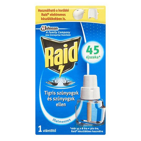 A Raid® elektromos szúnyogirtó készülék egész éjszakára nyújtó védelmet biztosít a szúnyogok ellen. Hatását egy átlagos méretű (30 m3) szobában is kifejti, akár résnyire nyitott ablakok és világítás mellett is. Folyamatos és diszkrét védelmet nyújt. Nem kell többé minden este utántöltőt cserélni vagy aeroszolt használni.