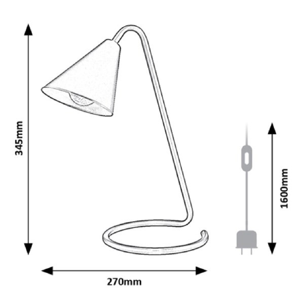 Az indusztriális stílusban készült Monty asztali lámpát elsősorban a hálószobába vagy a dolgozószobába ajánljuk. A fehér színű lámpa anyaga teljes egészében fém, különlegessége pedig az alul kör alakban meghajlított szár, amely a hagyományos dísztalp helyett biztosít stabil megtámasztást a lámpának. A fehér búra lefelé szélesedő, gúla formájú. A Monty egy darab, legfeljebb 40 W teljesítményű fényforrással használható, a foglalat típusa E14. Ha a hálószobában helyezzük el a lámpát, meleg fehér fényű fényforrást ajánlunk hozzá, míg a dolgozószobában praktikusabb lehet egy természetes fehér fényű fényforrás használata. Az asztali lámpa szélessége 270 mm, magassága 345 mm. Ezt a modellt fényforrás nélkül szállítjuk.