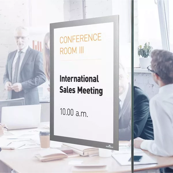 A4 formátumú öntapadó infokeret, iInformációk magas színvonalú és professzionális megjelenítése. A felhajtható mágneses keret gyors dokumentumcserét tesz lehetővé, segédeszközök nélkül egyszerűen felhelyezhető sima, teherbíró felületekre. Pl. üvegről visszaszedhető. A4 formátumú dokumentumokhoz, ideális lehet pl. helyiségek megjelölésére, eligazító információk vagy ajánlatok megjelenítésére. Üveg felületen két oldalról olvasható. A keret mindkét oldalról azonos megjelenésű, Álló és fekvő formátumban is használható. Ingyenesen letölthető, előre elkészített sablonok elérhetőek a www.duraprint.eu oldalon. Külső méret: 236 x 323 mm